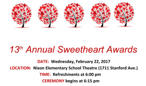 13 th Annual Sweetheart Awards DATE: Wednesday, February 22, 2017 LOCATION: Nixon Elementary School Theatre (1711 Stanford Ave.) TIME: Refreshments at 6:00 pm CEREMONY begins at 6:15 pm Join us to celebrate the special people in our community that go the extra mile to make a positive difference in the lives of children…